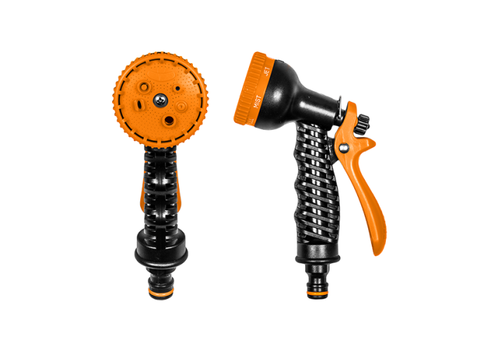 Пістолет для поливу пластиковий 7 режимів, BLACK LINE, ECO-2109 Дає можливість здійснювати полив обраним типом струменя (7 режимів) з необхідною інтенсивністю потоку. Інтенсивність напору регулюється за допомогою курка, котрий має фіксатор положення для безперервної подачі води. Пістолет має адаптер під конектор для простого і надійного підключення до поливального шланга.